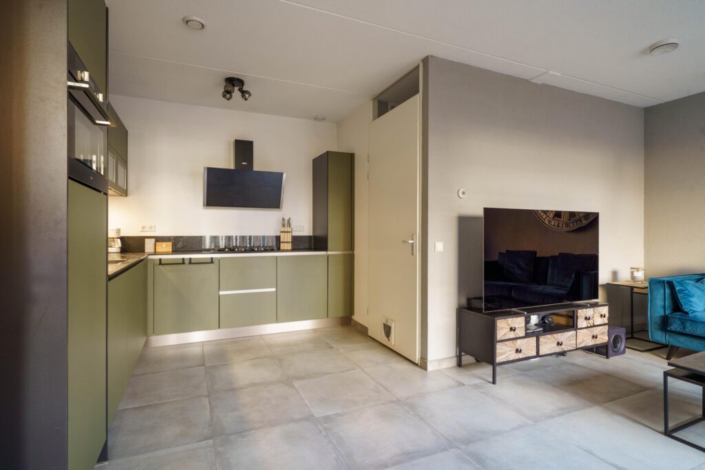 Entreehal met meterkast en toegang tot de lichte living. De woonkamer is tuingericht en voorzien van plavuizen met vloerverwarming en airconditioning. De moderne open keuken (2019) bevindt zich aan de achterzijde en is uitgevoerd in L-opstelling met veel kastruimte en alle wenselijke apparatuur (koelkast, vriezer, vaatwasser, combi-oven en een brede 5-pits gaskookplaat).