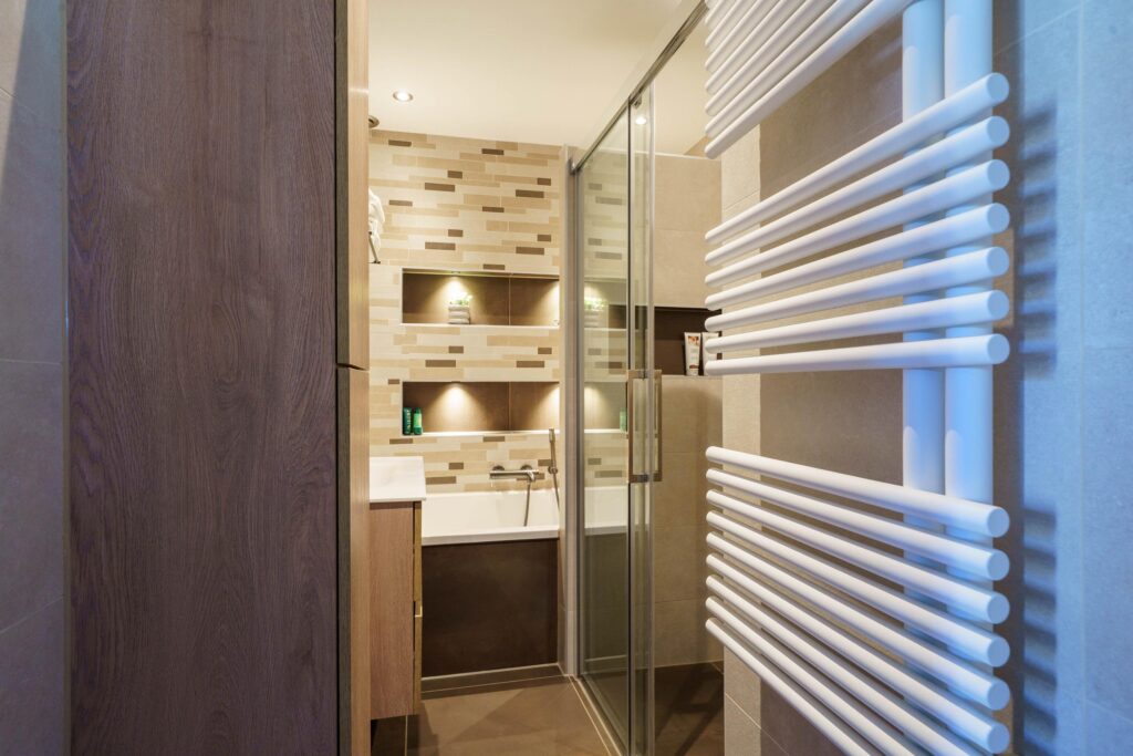 • Luxe badkamer met ligbad, inloopdouche, wastafelmeubel, handdoekradiator en verlaagd plafond met spotverlichting