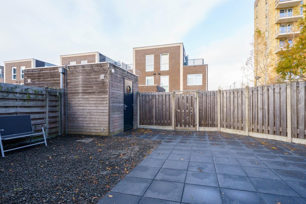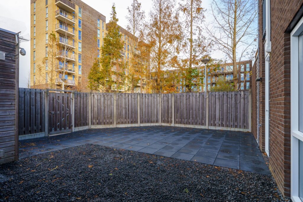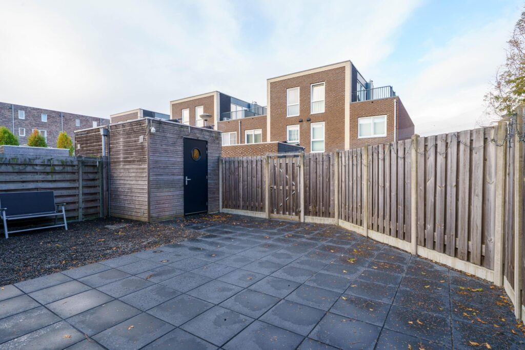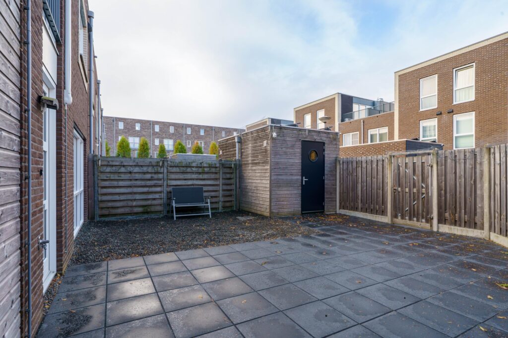 De woning beschikt over een brede en verzorgde voortuin, aangelegd met sierbestrating, siergrind en hoge schuttingen voor privacy. In de voortuin staat tevens een houten berging met elektra.