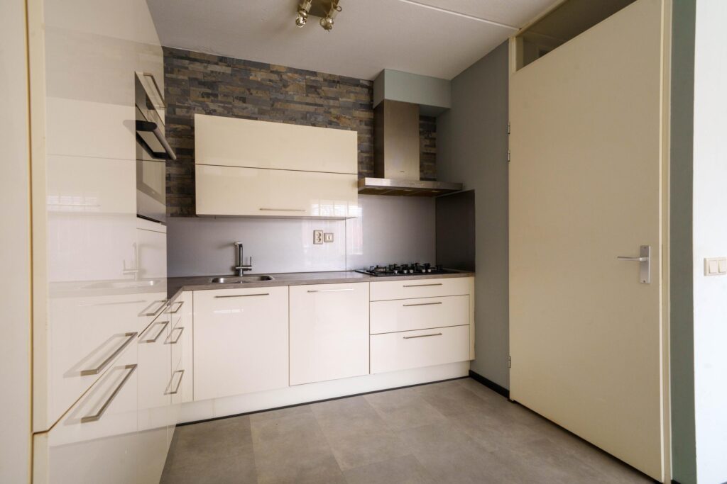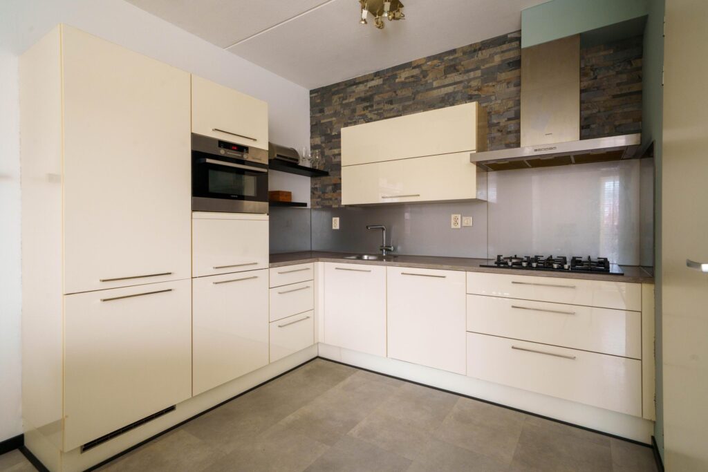 • Keuken in L-opstelling met diverse apparatuur wo koel-/vriescombinatie, vaatwasser, combimagnetron, gaskookplaat en afzuigschouw