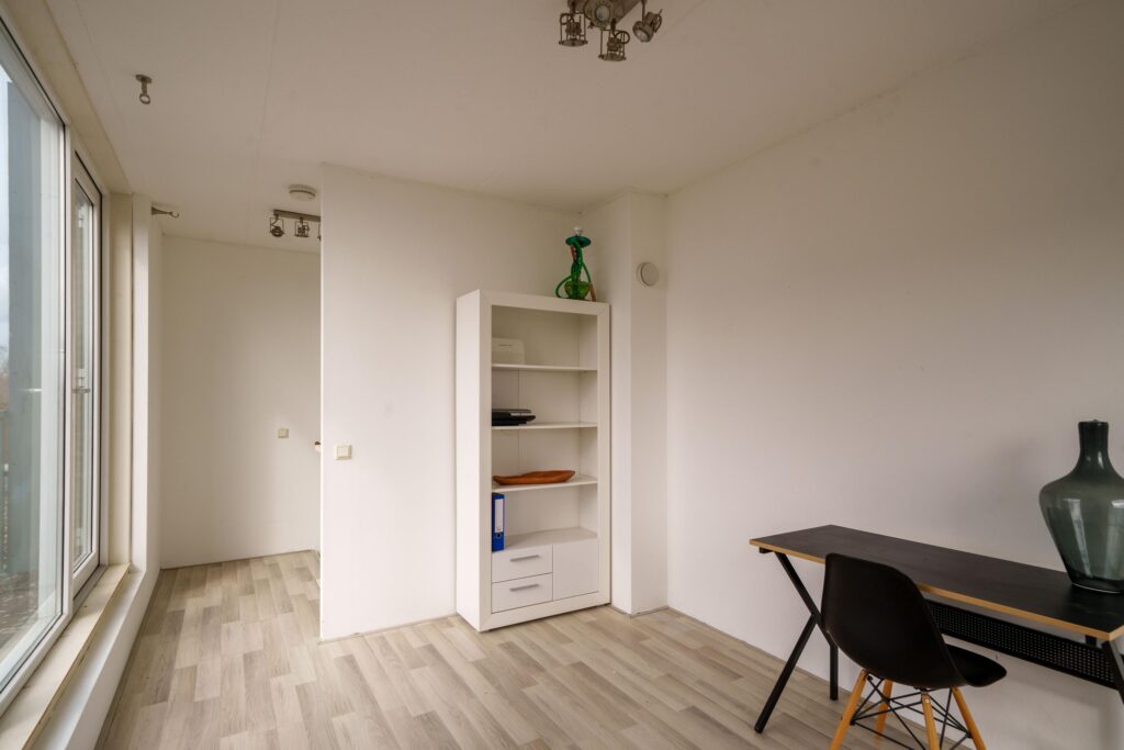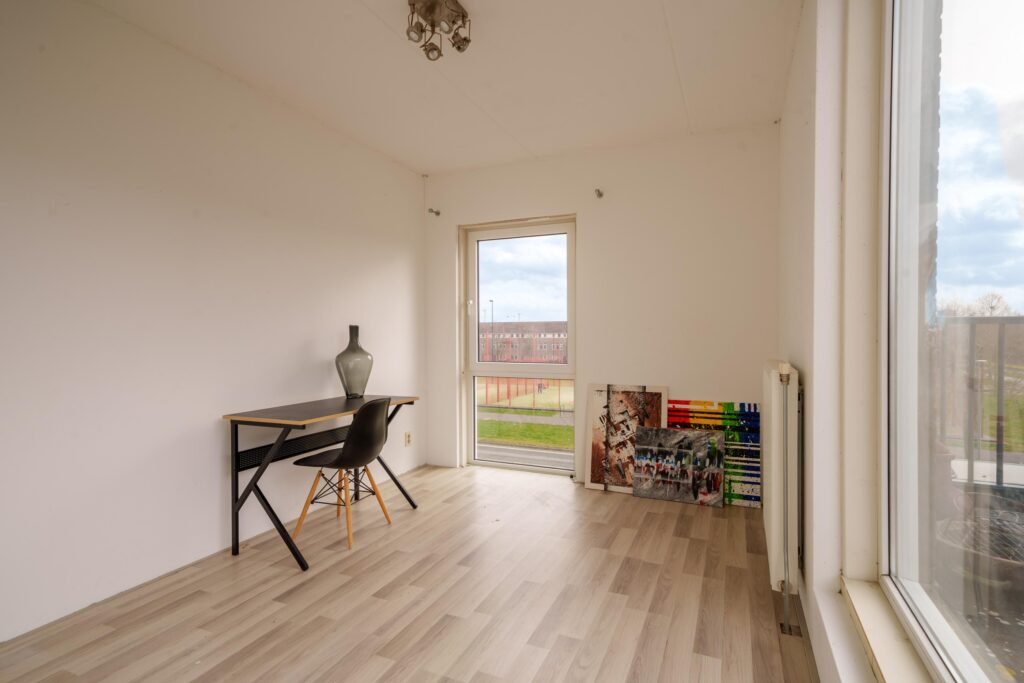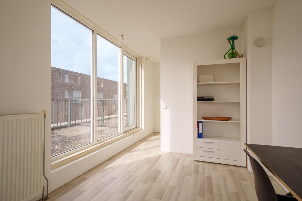 Derde slaapkamer met toegang tot het dakterras, gelegen op het zuidwesten. Door de pui naar het dakterras is deze ruimte bijzonder licht en sfeervol.