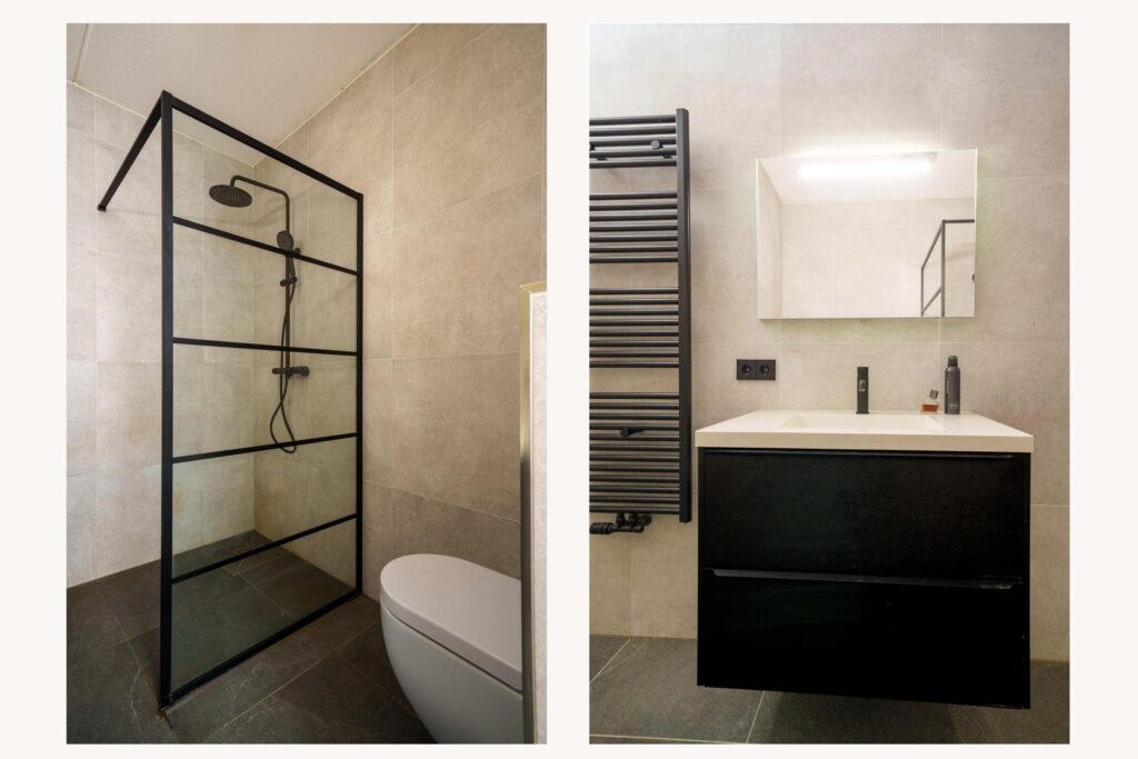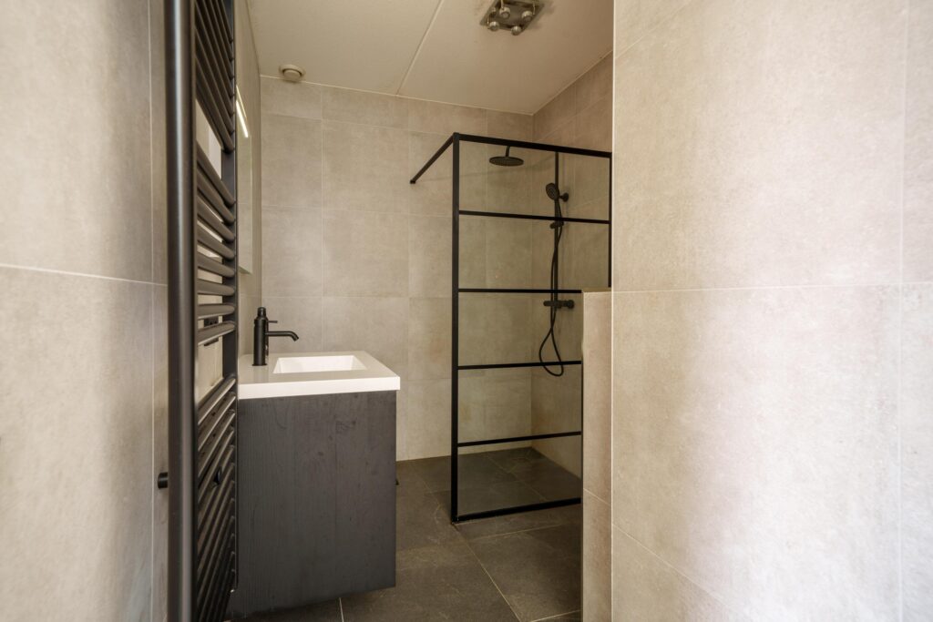 • Moderne badkamer (2023) met inloopdouche, wastafelmeubel, zwevend toilet en designradiator