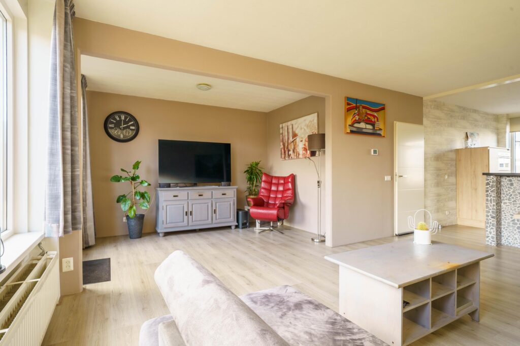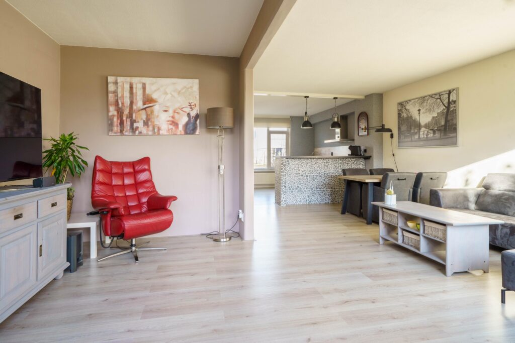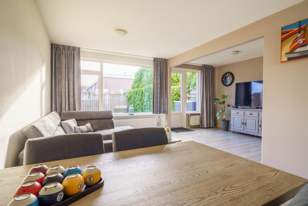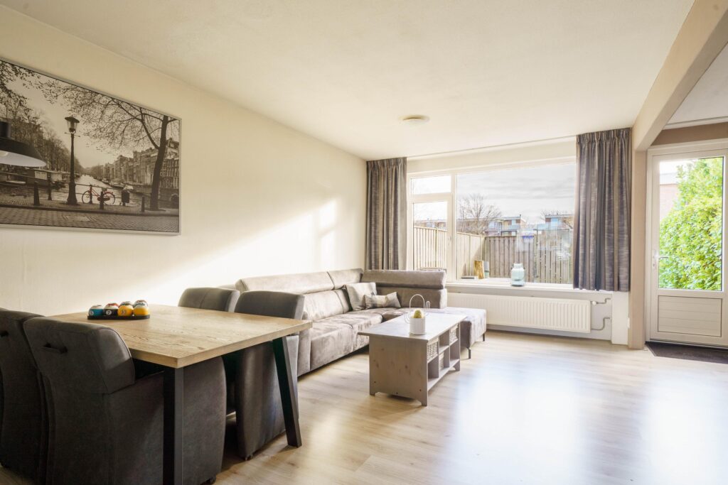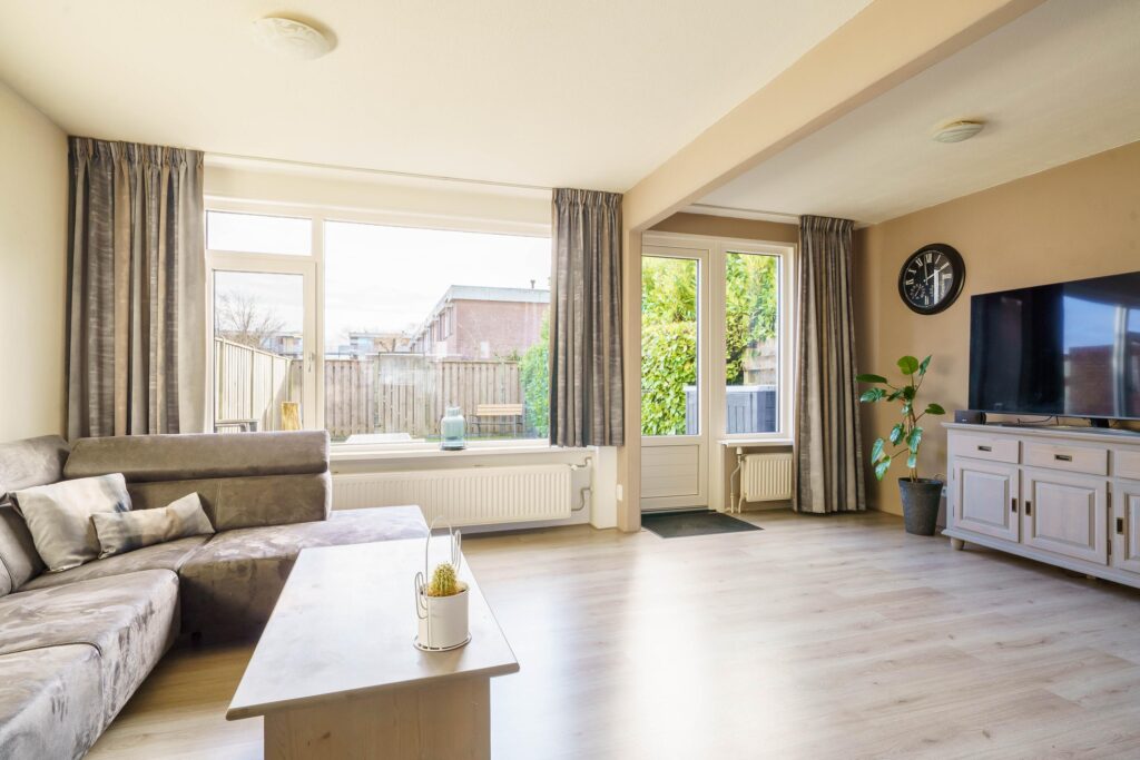 • Brede, tuingericht woonkamer met veel lichtinval en deur naar de achtertuin