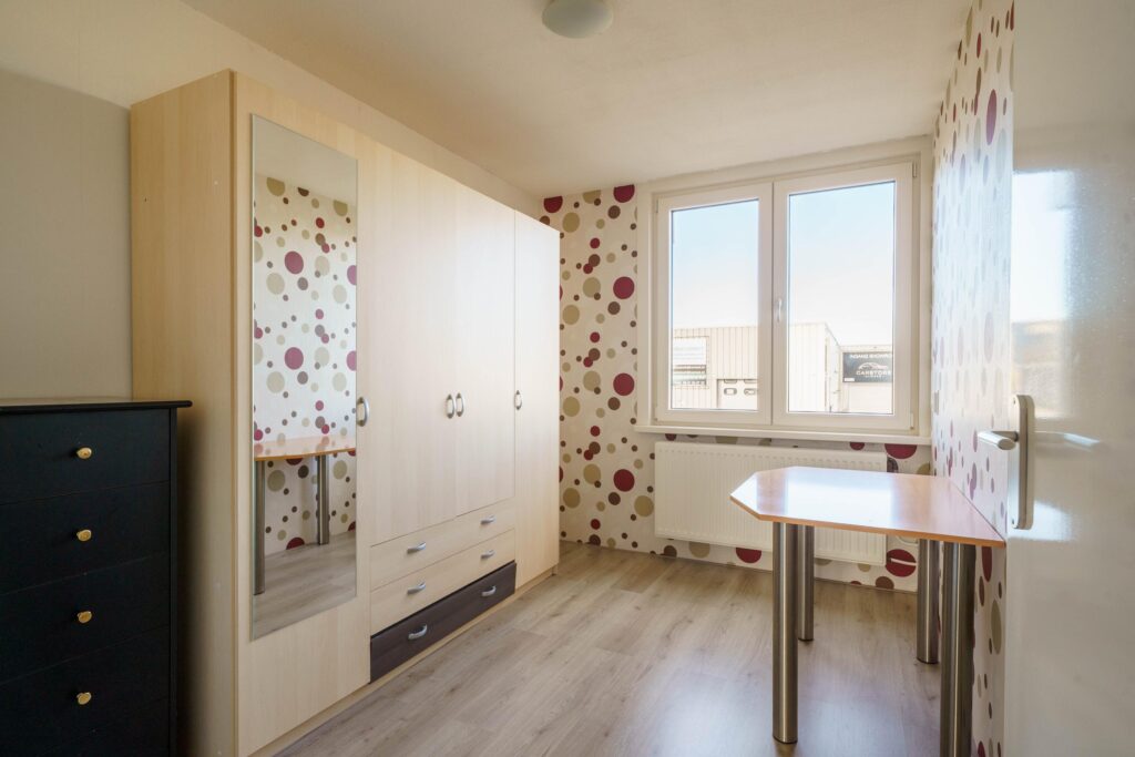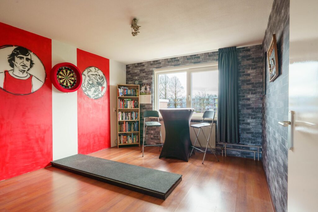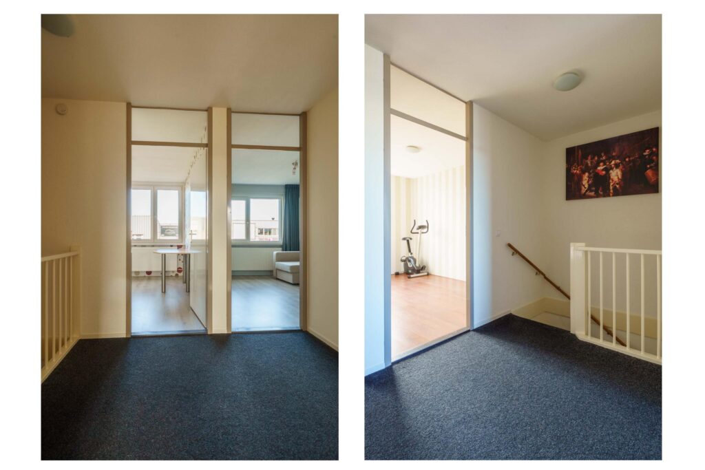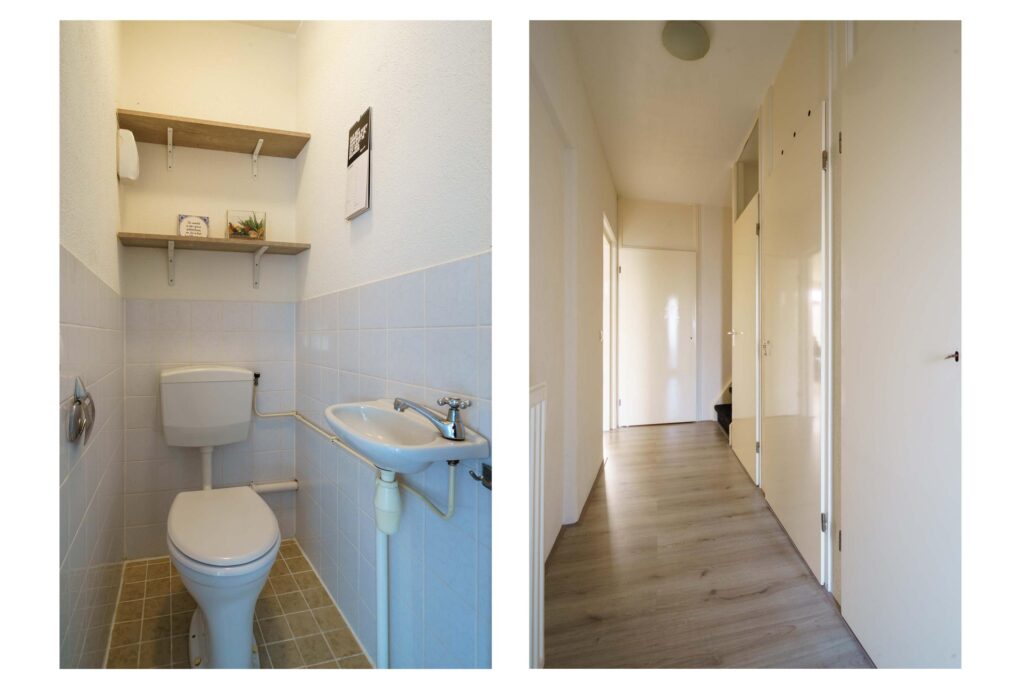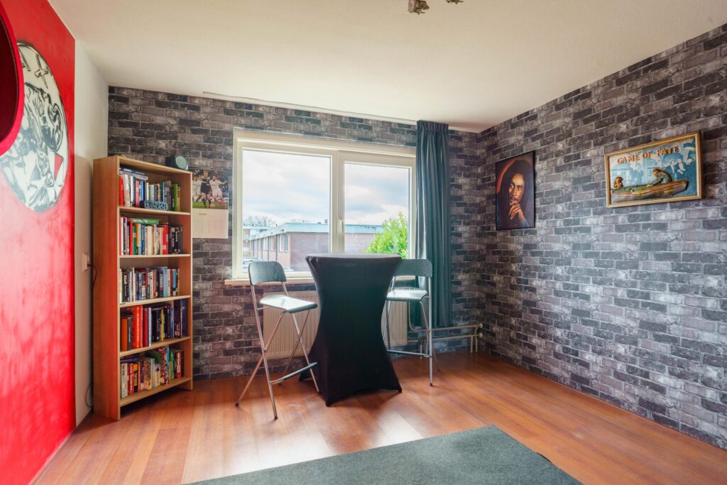 De overloop geeft toegang tot maar liefst vier slaapkamers en de badkamer. De badkamer beschikt over een inloopdouche, tweede toilet, wastafelmeubel en een raam in de zijgevel, wat zorgt voor daglicht en ventilatie. De slaapkamers op de verdieping zijn voorzien van laminaatvloeren en met behang afgewerkte wanden, waardoor een frisse en moderne uitstraling ontstaat.