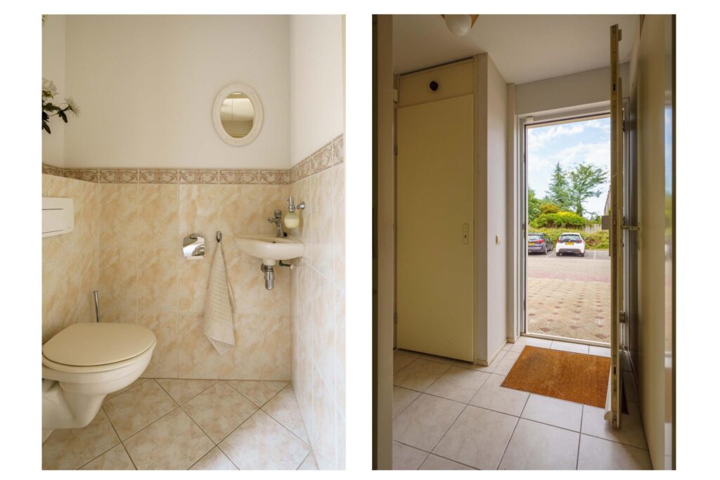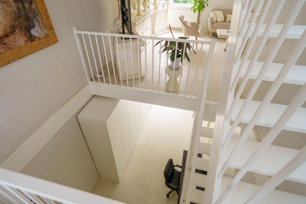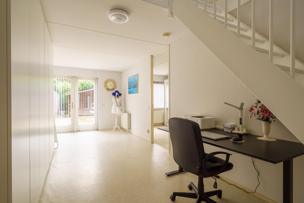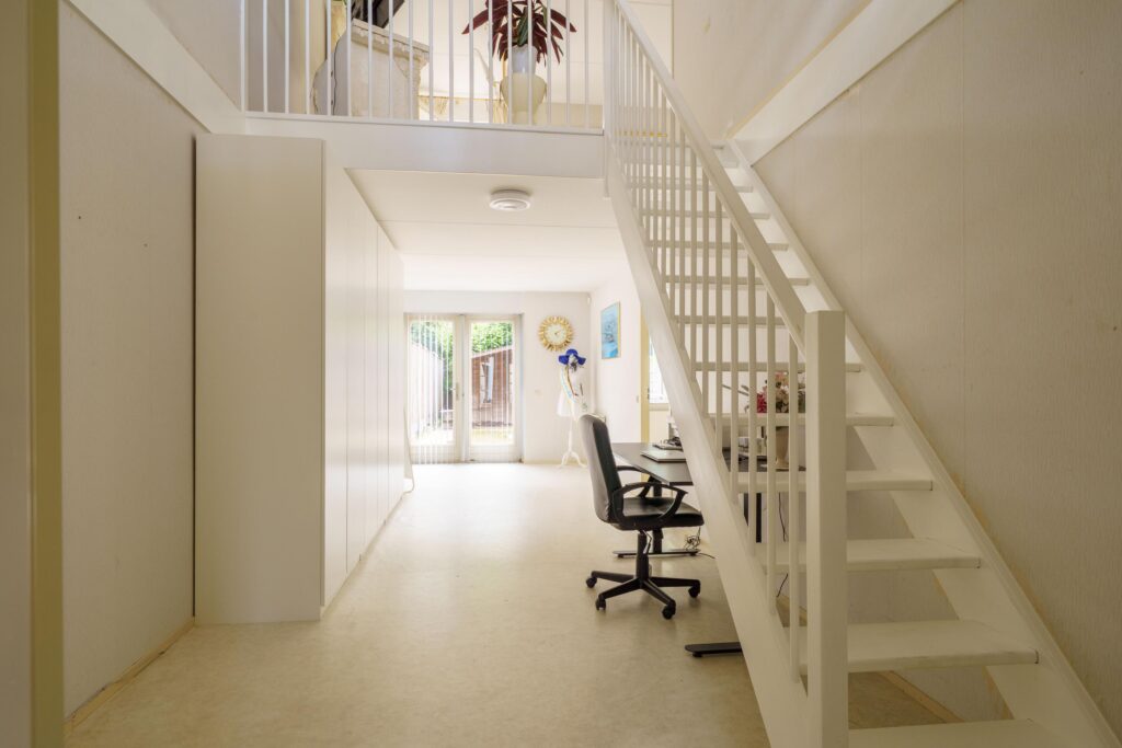 Entree met kleine hal, meterkast, toilet en toegang tot de inpandig garage/berging (15 m2) met dubbele deuren aan de voorzijde. Deze is momenteel in gebruik als wasruimte/kastenkamer. Hier bevinden zich tevens de aansluitingen voor de wasmachine/droger en de cv-ketel (huurketel Intergas 2020, eventueel gratis opzegbaar). Vanuit de hal bereikt u een ruime werk-/tuinkamer met vide naar de eerste 1e verdieping en dubbele openslaande deuren naar de achtertuin. Via deze werk-/tuinkamer bereikt u tevens de slaapkamer op de begane grond. De vloer op de begane grond is afgewerkt met vinyl en de wanden zijn v.v. behang. Via de open trap in de vide bereikt u de 1e verdieping.