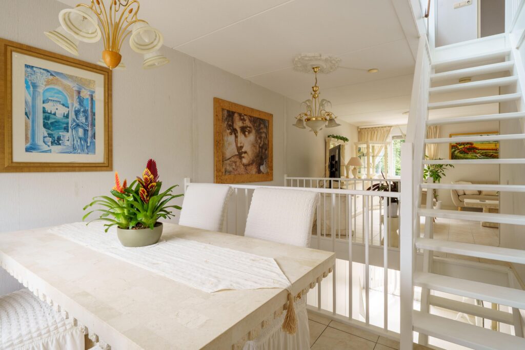 Hier treft u de living met veel lichtinval door de grote ramen aan de voor- en achterzijde van de woning. De keuken met aparte eetkamer is aan de voorzijde gelegen en v.v. een inbouwkeuken in U opstelling met aparte kastenwand en v.v. diverse inbouwapparatuur w.o. een koel-/vriescombinatie, oven, vaatwasser, inductiekookplaat en een afzuigschouw (recirculatie). De woonkamer is aan de achterzijde van de woning gelegen en via de ramen heeft u een prachtig uitzicht op de achterliggende natuur. De vloer op deze verdieping is v.v. plavuizen en de wanden zijn v.v. behang. Via de open trap bereikt u de 2e verdieping: